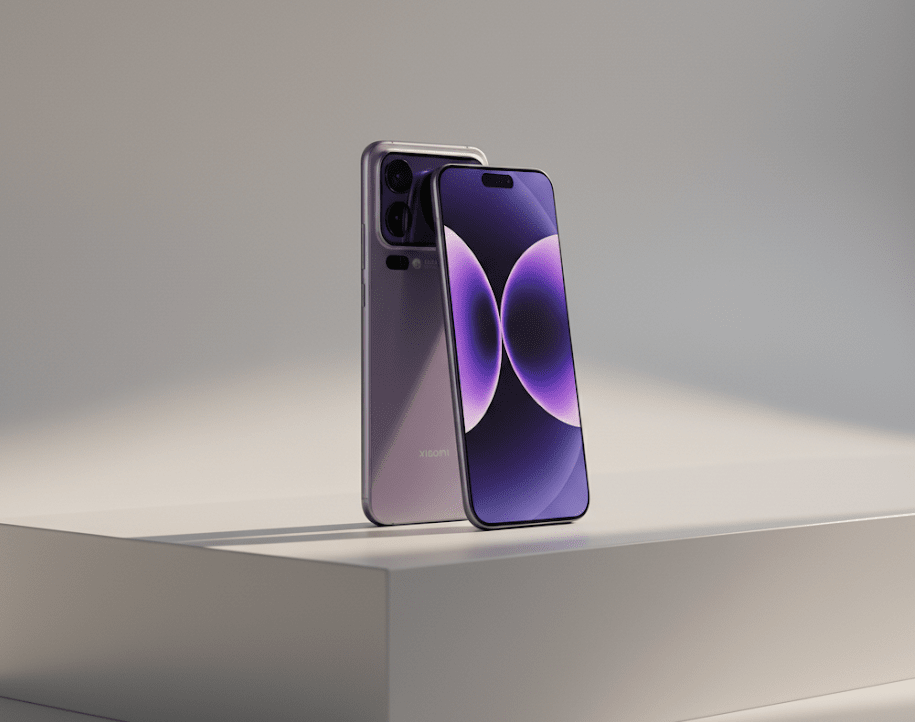 Deze afbeelding toont twee strakke, paarse smartphones die elegant op een wit kubusvormig object zijn geplaatst. De telefoon aan de linkerkant toont de achterzijde, compleet met een prominent camerablok en het ‘Xiaomi’-logo. De telefoon aan de rechterkant presenteert het helder verlichte scherm, dat een abstract paars design weergeeft. De minimalistische, lichte achtergrond met zachte schaduwen zorgt voor een professionele en focusgerichte presentatie. De tekst “Xiaomi 17 Pro Max” is discreet rechts in de afbeelding geplaatst, wat deze compositie ideaal maakt voor productrecensies, technische artikelen of vergelijkende analyses van dit specifieke model.